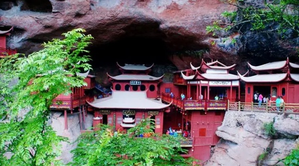 寺庙始建于南宋绍兴十六年(公元1146年),洞穴上部宽30多米,下部宽却只有10多米,呈倒三角形。古人以独木擎天的方式解决岩势上宽下窄的难题,这也是岩寺最神奇的地方。一根柱子落地,上面建起了四幢楼阁,整个重檐歇山式的层楼叠阁包括上殿、蜃阁、观音阁、南安阁等建筑,皆仗一柱支撑,顶部更无片瓦。若用“悬空寺”、“飞来寺”、“独木寺”来称呼它皆名副其实。