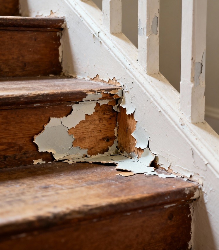 楼梯的油漆可能会因为磨损、老化或意外损坏而脱落。